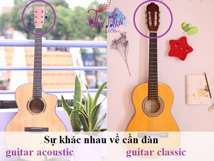 Khi nhìn vào cần của 2 loại guitar này, ta sẽ thấy đàn guitar acoustic thường có cần đàn nhỏ hơn so với loại guitar classic